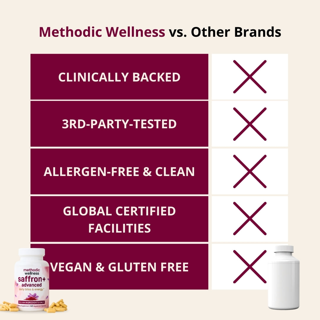Cooking saffron contains about 2mg per teaspoon. Our clinical extract contains 88.5mg of standardized saffron - that's 40x more concentrated, plus it's standardized for the active compounds (0.3% safranal) that actually cross the blood-brain barrier. You'd need to eat $50 worth of grocery store saffron daily to get the same amount.