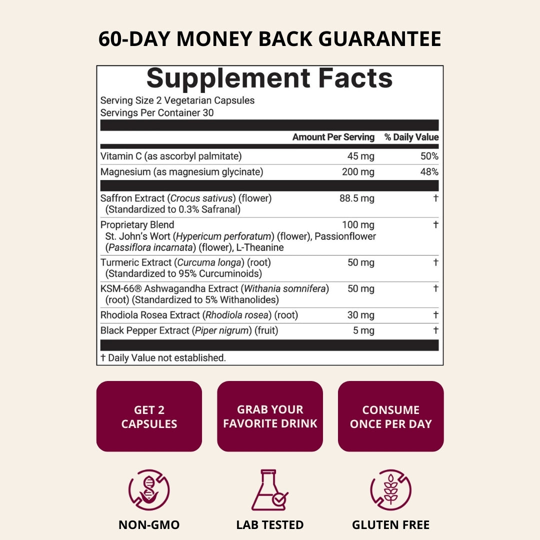 This is the most important question you can ask.The answer comes down to three things:Dose, Purity, and Synergy.1. The Dose:We use the exact88.5mg clinical doseof Saffron proven in studies to be effective. Most other brands use a weak, ineffective dose (often as low as 10-30mg) hidden in a "proprietary blend."2. The Purity:Most saffron on the market is fake or diluted. We are third-party tested and provide a Certificate of Analysis to prove our saffron is real and potent.3. The Synergy:Saffron is just the start. Our formula includes 9 other synergistic ingredients like Ashwagandha, L-Theanine, and Magnesium, plus Black Pepper for2000% enhanced absorption.You are getting a complete, pharmacist-vetted formula, not just a single underdosed ingredient.