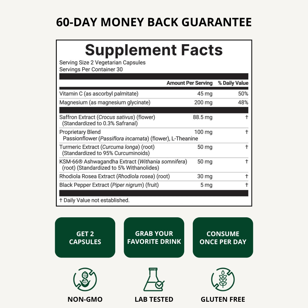 Taking our saffron supplement is simple, hassle-free, and designed to integrate seamlessly into your daily wellness routine.
