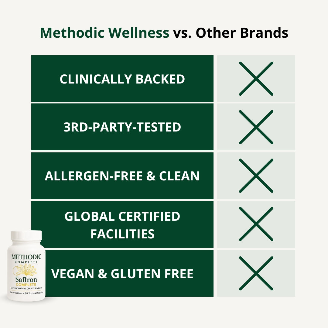 Cooking saffron contains about 2mg per teaspoon. Our clinical extract contains 88.5mg of standardized saffron - that's 40x more concentrated, plus it's standardized for the active compounds (0.3% safranal) that actually cross the blood-brain barrier. You'd need to eat $50 worth of grocery store saffron daily to get the same amount.